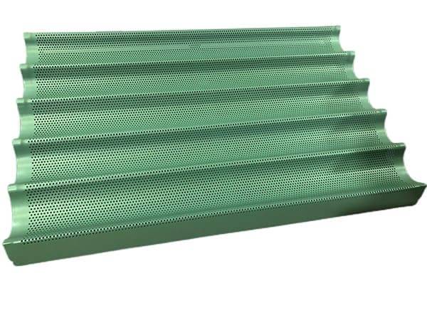 The baguette baking pan is typically made of aluminum with a thickness of 1.0mm or 1.2mm and perforated surface, it is non stick with commercial grade Telfon coating.