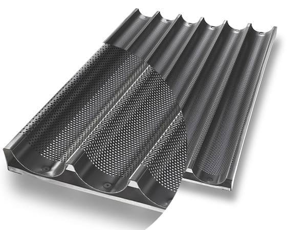 The 6 channels baguette tray is made of durable, lightweight aluminum with a thicknesses between 1.0mm and 1.2 mm. This pan has been designed to work in conjunction all baking systems without compromising hygiene or safety! making cleanup.