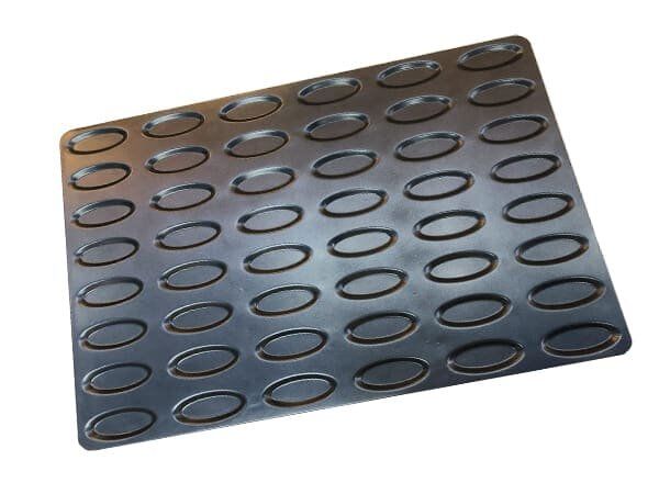 Croissant pan non stick is 48-on, 8 rows of 6, overall pan measures 600 x 800mm