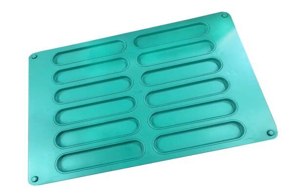Hot dog pans non stick is 12-on, 6 rows of 2, overall pan measures 500 x 700mm