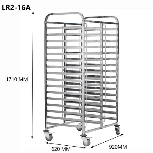 16-level, double-arranged stainless steel bakery cart for easy storage and transport of 32 pans